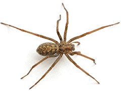 The house and black widow spiders belong to the same family. The house spider is more commonly found within the house, whereas the black widow spider is more likely to be found in dark crawl spaces, garages, or outhouses. The house spider varies in colour from dirty white to nearly black, with visible markings on its body. Its first pair of legs is almost three times the length of its whole body. It builds webs in dark corners, under furniture, and anywhere insects might be caught.